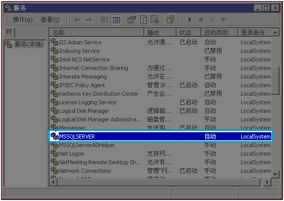 如果重启后 SQL 服务没有自动启动,您可以到系统的服务管理控制台中(点击“开始/运行”,输入“services.msc”),找到 "MSSQLSERVER" 项,手工启动该服务。