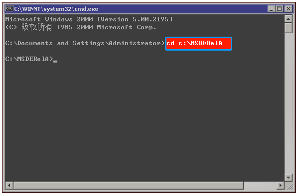 按“开始/运行”,输入 “CMD” 回车,打开命令符窗口。输入以下命令进入 C:\MSDERelA