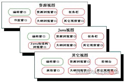 与IVJ一样,Eclipse开发环境也被称作工作台,主要由三部分组成:视图、编辑窗口和观察窗口。下图为工作台的关系结构略图: