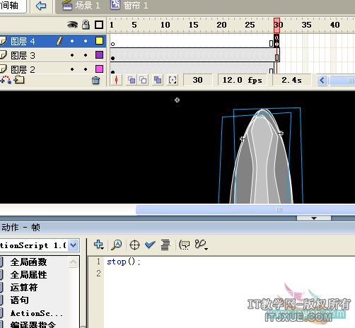 ÔÙн¨Ò»¸öͼ²ã4£¬ÔÚͼ²ã4µÚ30Ö¡²åÈë¹Ø¼üÖ¡¡£Õâ´Î²»ÍÏÔª¼þÁË£¬µãÏÂͼ²ã1£¬È»ºó°Ñͼ²ã1³¡¾°ÖеÄÔª¼þ°´Ctrl+C¸´ÖÆ£¬ÔÙµãÏÂͼ²ã4µÚ30Ö¡°´Ctrl+Shift+V°ÑËüÕ³Ìùµ½ÔÀ´µÄλÖã¬Í¬ÑùµÄ£¬ÔÙµãÏÂͼ²ã2£¬°Ñͼ²ã2µÄͼÐÎÒ²¸´ÖƹýÀ´Õ³Ìùµ½ÔÀ´µÄλÖá£×îºó£¬°´F9´ò¿ª¶¯×÷Ãæ°å£¬ÊäÈëstop();
