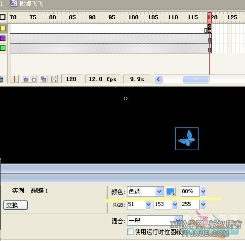 新建一个名为“蝴蝶飞飞”的影片剪辑,在这里要把刚做好的两个蝴蝶飞舞的元件放进来,而且要让它们在不同时间段开始飞出来。在图层1第10帧插入关键帧,打开库,把蝴蝶元件拖到场景中来,在第120帧插入帧。再新建一个图层2,在第50帧插入关键帧,同样再拖入一个蝴蝶元件进来,这次可以拖一个不同路径的进来。同样在第120帧插入帧。再新建一个图层3,在第120帧插入关键帧,再插入一个蝴蝶元件进来,这次随便你要哪个,不过拖进场景后可以把它改变下方向。最后点击120帧(哪个图层都行),然后按F9打开动作面板,输入stop();(三只蝴蝶的位置要适当调整下)注:如果觉得蝴蝶的颜色不喜欢,和场景里的图片不适合的话,可以点击下想改变颜色的蝴蝶,打开属性面板,选择颜色—色调,然后调整好自己要的颜色,再改变下透明度就行了。