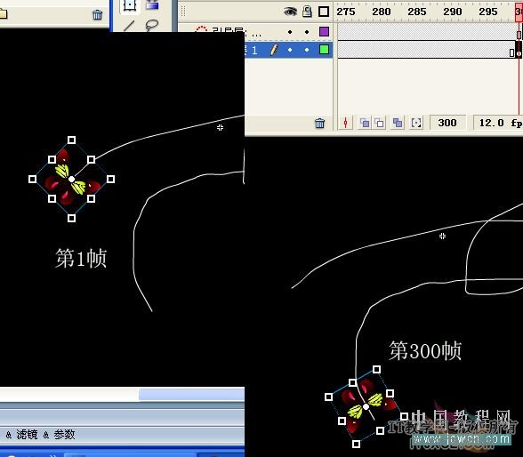 画好引导线后,在引导层第300帧插入帧,再在图层1第300帧插入关键帧,点击图层1第1帧,在这一帧把蝴蝶放在引导层的一端,也就是要开始飞的一端,再点下第300帧,把它放在另一头。