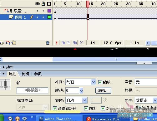 点击第1帧右击创建补间动画,再在补间动画的属性中把调整到路径勾上,这样一只沿着指定路径飞舞的蝴蝶就做好了。最后,在图层1第340帧插入帧。