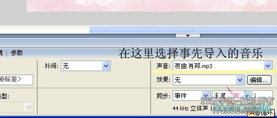 到此,全部动画都做完了,不过,好看的动画怎么能没有好听的音乐做伴呢,在场景中再新建一个图层为音乐,然后选择文件—导入—导入到库,导入一首事先准备好的音乐,点击音乐图层,然后在属性面板中选择刚导入的音乐。