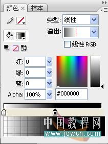 5. 新建一MC,取名为“遮罩文本”,将文本元件拖入居中对齐,实例名称为:wb_mc, 在“使用运行时缓存”前打钩。在170帧插入帧,上锁。新插入一图层,画一无笔触线型填充色,左色标透明度为0,右色标透明度为100的矩型,矩型左边与文本右边对齐,如下图: