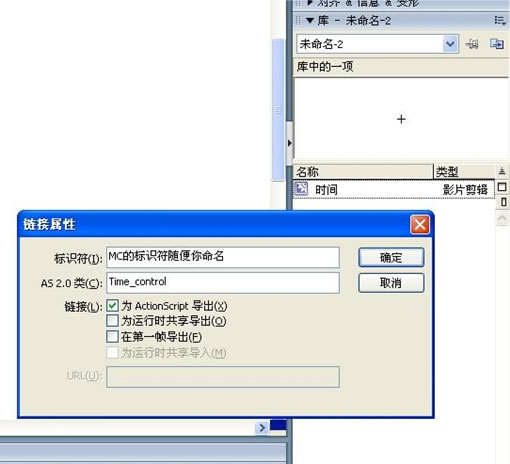 就拿上节例子Time_control.as来说吧,要关联到库里的元件'时间'