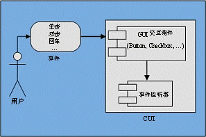 一个用于交互的GUI组件会被预先定义它可能遇到的事件,软件开发者即可根据开发需求来编写事件监听器,响应部分或全部的事件触发,图1.7展示了这个触发过程。作为开发者,我们首先需要了解特定的GUI交互组件支持哪些事件,之后便可以根据需求写出相应的事件监听器。