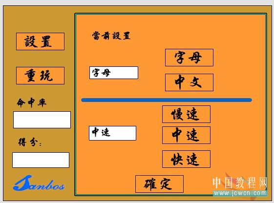 回到主场景。第一层“背景”在第2帧插入关键帧,将“设置”,“重玩”按钮从库中拖入,放到左上部。打开属性面板,分别将两个按钮命名为:“sz_btn”,”cw_btn”.在左边稍下边一点入一静态文本,内容为“命中率”,在它的下边放一动态文本,在属性面板中命名为“mzl_txt”;在它的下面放一静态文本,内容为“得分”,在它的下面,放一动态文本,在属性面板中命名为“df_txt”.在右半部画一矩形,然后在这个矩形上放一个静态文本,内容为“当前设置”。然后放两个动态文本,内容分别为:“字母”,“中速”。打开属性面板,将两个动态文本分别命名为:“yysz_txt”,”sdsz_txt”.将“字母”“中文”,“慢速”,“中速”,“快速”按钮拖入,放到矩形的右半部。在属性面板中分别命名为:“zm_btn”,”zw_btn”,”ms_btn”,”zs_btn”,”ks_btn”.如下图:
