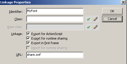 如果是as2的话,新建一个Fla文件share.fla,然后在库里新建一个字体文件,然后设置他的标识为MyFont,随便选择系统内的一种字体,然后选择linkage里的导出as,导出runtime sharing,导出第一帧,然后在url处填写share.swf,然后编译成share.swf