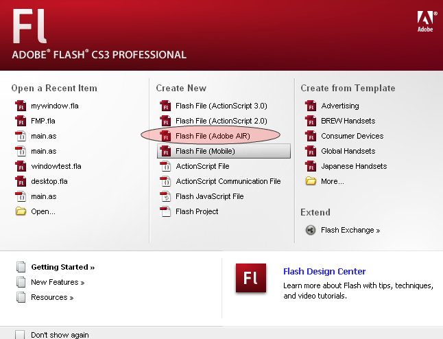 下面就用一个示例来向大家展示,打开FLASH CS3创建一个FLASH AIR文档,如图所示: