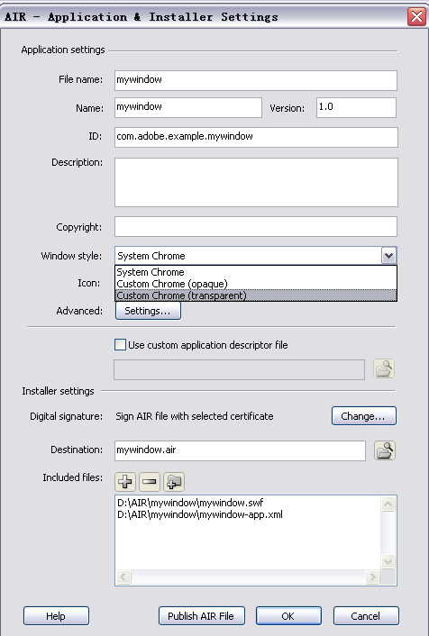 到现在我们的窗体还会显示标题栏,的以我们还要对窗体进行地一下配置,选择Commands->AIR -Application and Istaller Settings,如下图所示: