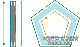 下面我们将把封套上的节点对齐五边形上的节点。如图所示,矩形左边接近绿色的节点将与五边形外围的节点重合, 右边接近橙色的节点将与五边形内部的节点重合。