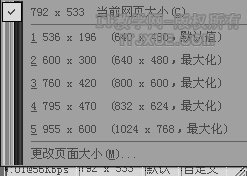在设计网页时,可实时调节当前页面为在客户端显示的分辨率,以便预览当前效果。大家查看FrontPage 2003界面右下端状态上显示网页大小的区域,默认为792×533,右键单击后,弹出如图1所示菜单,在此可设置任意分辨率方便进行预览。