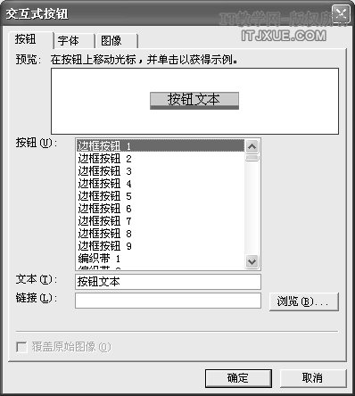 点击菜单栏上的“插入→交互式按钮”,弹出如图3所示对话框,在“按钮”标签页中,设置按钮的显示文字、样式以及链接。在“字体”标签页中设置其相关选项。最后,我们再切换到“图像”标签页,设置悬停图像及鼠标键按下时的图像等。