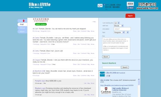 简单,它让你在看到美女/帅哥的当下或之后,可以来到此网站,告诉全世界你在某某处看到了这么样的美女/帅哥。来到Likealittle,只要填入此人是男(是女),髮色是什么颜色,在何处看到,再写一句讚颂的话,哗,这样就搞定了。接下来你就会看到Likealittle让你的留言和其他和你同样煞到哪个帅哥美女的,放在一起,颇为壮观,譬如在史丹佛大学裡面的留言串,可以看到以下: