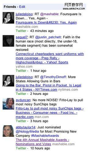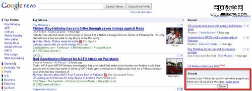 该输入框邀请用户输入Twitter帐号,用户输入帐号并点击保存之后,谷歌新闻就将刷新,并显示出用户好友在Twitter上分享的新闻链接。