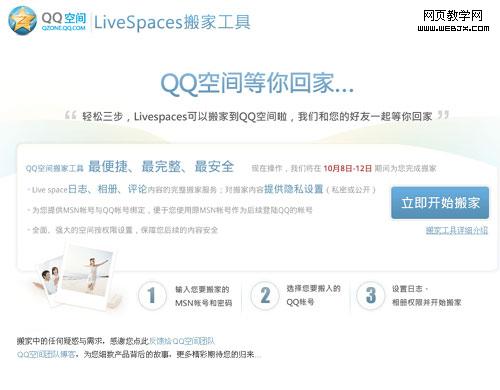 QQ:先看QQ空间的MSN Live Spaces博客搬家工具,显眼的“QQ空间等你回家”,多了一份温馨,似乎有几分家的味道。
