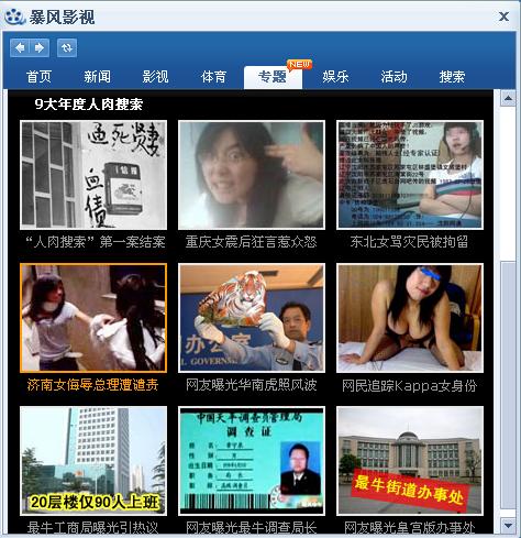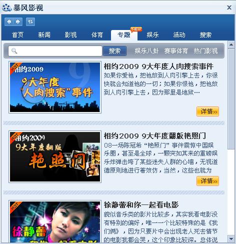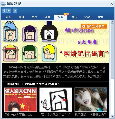 总结每个专题,都有总结的益处。“年度人肉搜索”中著名的“人肉搜索第一案”,估计是2008年是人们茶余饭后闲聊的一个好谈资。2008年这种极不靠谱,但绝对觉得值得我们深思的事情不在少数。比如“9大艳照门事件”,自从陈冠希的艳照门事件暴露后,似乎网上有很多女人甚至是小女孩愿意拿自己的性感露出来示人以博得点击率;年度“9大年度煽情影片”,为用户介绍了很多很好的温馨感人的影视剧,《立春》、《下流与智慧》、《一半海水一半火焰》、《三陪保姆》、《不要嘲笑性》等等,让我们对“情色影片”有了更多的了解;而专题“年度9大网络热名词”则是很特别的一个总结,相信很多人还不完全知道“囧”、“做人不能太CNN”、“今天被雷到了”等等这些热名词的来历和含义。如果不想太落后,就赶快到暴风2009上看看吧。值得注意的是,所有这些影片都可以在暴风2009上一点即播。(如图2、3)