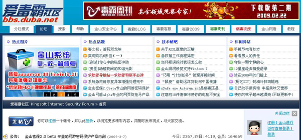 爱毒霸社区(bbs.duba.net)是金山软件期下最受用户欢迎的论坛社区之一,自推出之后,一直采用Discuz! 论坛程序。康盛创想(Comsenz)发布最新版本Discuz! 7.0之后,爱毒霸社区也在第一时间升级,升级后的爱毒霸社区更加稳定,全新的界面风格深受用户喜欢,社区的互动性显著增强,注册用户对比去年同期水平大幅增长,论坛发帖、回帖量也有所提高。