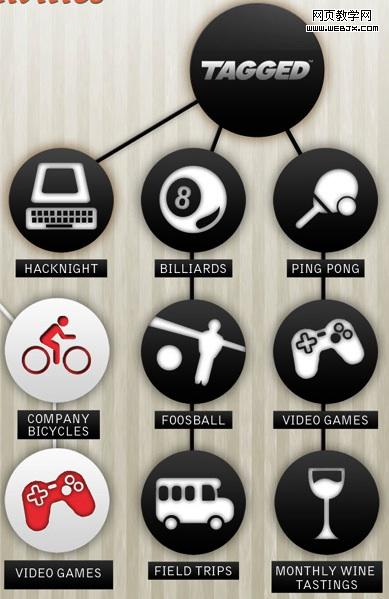 ▲ Facebook:桌上足球、一年一次的游戏日、乒乓球桌。Twitter:足球队、慈善用途的制酒活动、桌面足球、电视游戏器、乒乓球桌。