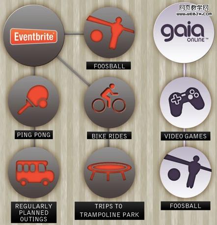Eventbrite:桌上足球、乒乓球、自行车、例行性的出游、到蹦床乐园的行程(这个好特别);Gaia:电视游乐器、桌上足球。