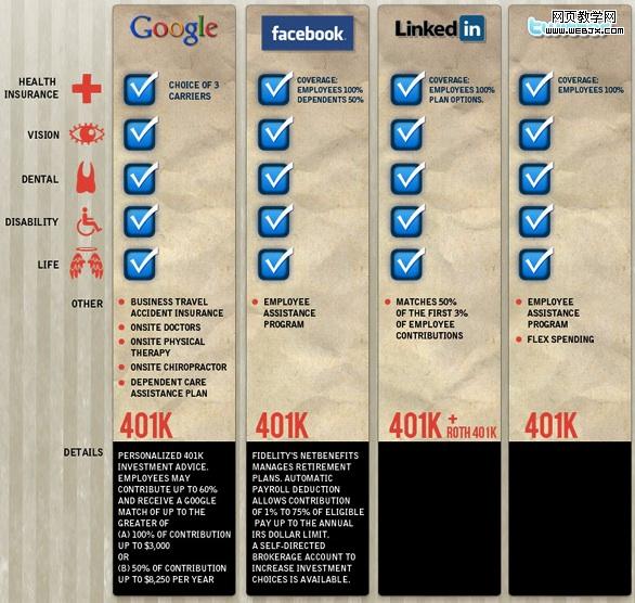 从这张图表可以看到,每家公司都提供了保险,包括健康、视力、牙齿、残障、死亡等等。而在退休方面,则使用美国通行的401K个人专户制度。