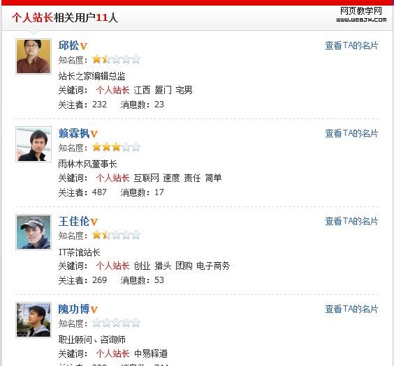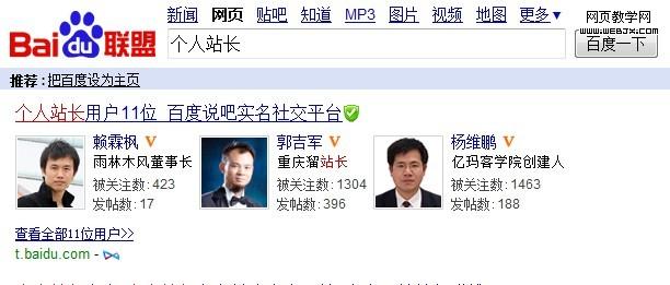 在推出“网络名片”(open card)的同时,百度也在搜索结果中嵌入了百度说吧网络名片数据,在百度搜索个人站长,第一个结果显示百度说吧平台网络名片中的个人站长资料。对于希望通过社交平台推广的用户来说,该功能有一定的吸引力。