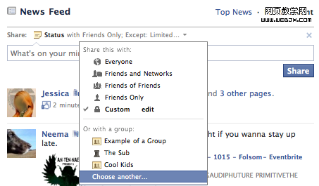 Facebook的动态信息发布机制将把新的群组作为一个信息的发布参数,来实现动态信息内容的共享。也就是说,用户可以设置将自己的动态信息,包括最新动态,新上传的视频,分享的链接等,设置为仅与指定的某个群组成员共享。只要用户接受群组作为自己的动态信息共享单位,那么用户的每一个新的动态都将共享给该群组的每一个成员。用户在群组内分享的动态信息在群组公共涂鸦墙(Wall)上发布,每条信息都将带有自己在群内的名字,以及共享群的群名称, 例如:[用户的群组内名称] > [群组名称]: [动态信息内容] .