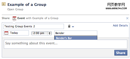 在Facebook主页上创建的活动无论在主页或活动页面中都还没有邀请群组的相关功能。不过,群组的创建者和管理者可以为群组开通活动功能,开通后群组内的成员可以在组内发起由该群组管理的组内活动,群组内活动还可以邀请非该组成员参加。群组活动将在主办群组的主页右边活动管理栏中显示。该活动所收到的任何评论不会在群组动态信息中显示。