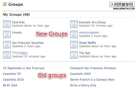 在新的群组出现之后,用户通过新的群组可以与一群朋友交流。在这个方面,新的群组在一定意义上已经替代了原有旧的群组所具备的功能。不过,FACEBOOK并不会将原有的群组删去,用户可以在主页左边导航栏中的群组栏目中选择“查看更多”,由此进入旧的群组。在群组公共主页中,用户点击“查看旧群组”即可看到所有原有的群组信息。目前还没有办法能把旧的群组更新升级为新的群组。一旦所有用户均可以从主页左侧的导航栏中直接进入新的群组之时,这也意味着旧的群组将无法再被创建。