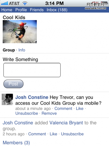 用户可以用手机登陆m.facebook.com,在主页下方的导航栏中进入群组。用户可以看到自己所在的所有群组,包括新的群组和旧的群组。用户在浏览新的群组时,会在输入框的上方显示粗体的“群组”,而用户在浏览旧的群组时,则显示的是“涂鸦墙”。在新耳朵群组中,用户可以发布新的信息动态,也可以接收到最新的群组动态信息。也可以查看群组的介绍,隐私设置,查看群组内的其他成员等。目前facebook的群组功能还不支持Iphone手机客户端。