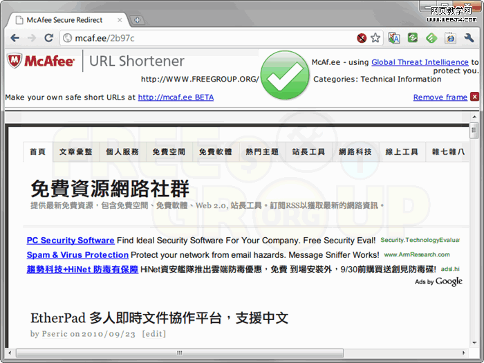 浏览 McAf.ee 缩网址时,上方会有框架显示此网站是否安全。