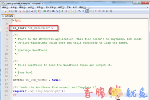 另外一个方法就是通过PHP函式的方式来启动网页压缩,但前提是您的系统必须支持Zlib Compression Functions才有办法启动,您可以丢个网页探针到服务器上查询看看就知道了。语法加入方式很简单,通过FTP连到WordPress根目录,然后下载其中的index.php并使用记事本开启,在
