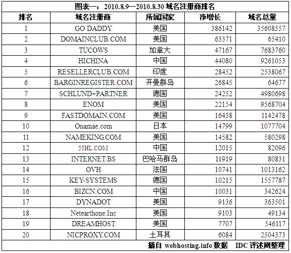 (图1) 2010.8.9-2010.8.30全球域名增长最快的注册商排名