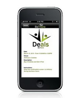 BeThereDeals集折扣网站和地理位置服务于一体。BeThereDeals在苹果iPhone手机上运行,能知道用户所处的位置,通知用户附近销售打折商品和服务的商店。目前,BeThereDeals只覆盖旧金山和纽约,未来将覆盖更多城市。