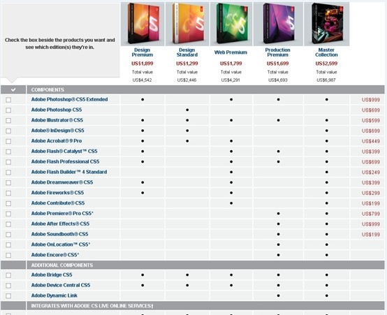 用户可以到Adobe官网上选择下载不同的套件版本或是不同的组件,只需免费注册Adobe ID即可。下图是Adobe提供的CS5五大版本的简单功能对比以及价格: