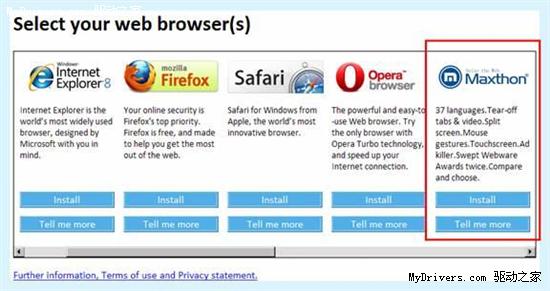 值得一提的是,我国傲游浏览器也被微软选入了浏览器选择界面。除此之外,浏览器选择界面提供的另外6款浏览器分别为Avant、Flock、Green Browser、K-meleon、Sleipnir、Slim。