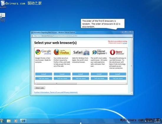 根据与欧盟达成的协议,微软将取消Windows对IE的捆绑,从今日起正式开始向欧洲Windows XP、Vista和Windows 7用户提供浏览器选择界面(ballot screen)。浏览器选择界面会在页面中提供12种浏览器的安装和说明,包括两屏,第一屏为微软IE8、苹果Safari、Google Chrome、Mozilla Firefox和Opera五大浏览器,第二屏为另外7款全球市场份额较高的浏览器。