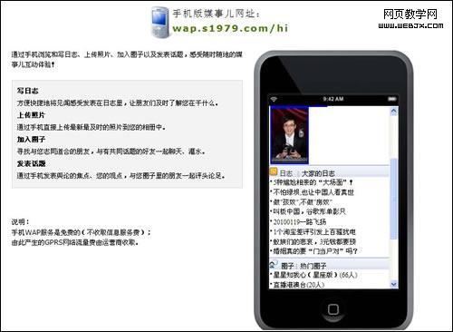 为了方便手机用户的在线交流,“中国时刻”还推出了“手机媒事儿”,用户通过访问“wap.s1979.com/hi”,就可以采用手机写日志、传照片、加入圈子以及发表微博,感受随时随地“媒事儿”的互动体验。