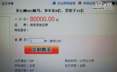 记者昨日在淘宝网一个名为“爱筑小屋”的母婴用品网店看到一件独特的商品——开心网001账号,一口价8万元!其商品描述称,该账号的争车位总资产9亿、买房子资产21亿、技能39级、咬人58级、朋友买卖总资产110万、身价14万,外加小号370个,小号中有阿斯顿马丁One77-(目前开心网里虚拟价值最昂贵的汽车)20辆。