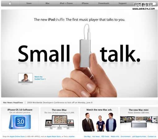 苹果公司的一贯做法是,通过主页告诉大家,网站还在正常运行着。他们把主页当做是一个广告板,总是展示一个他们最新产品的大幅广告,下面附带着三个当前同等重要的产品或新闻。如果对这四个条目都不感兴趣,可以点击上方的大型导航条,它被分成几部分来代表苹果公司的核心产品:Mac,iPod 和 iPhone,其下拉菜单中还有更多的链接,比如在线商店和售后支持。除此之外,还有个搜索栏。