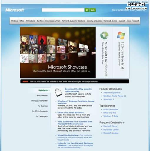 微软对自己的首页有着不同的诠释。首先,他们在顶部放置了一个风格相似的广告,目的是抓住人们的目光。这三幅巨大的图片广告——能够通过鼠标的滑过来轮流展示,很吸引人的眼球,但这可能会削弱其他两个广告的效应。在页面顶端的,是搜索栏和导航条。