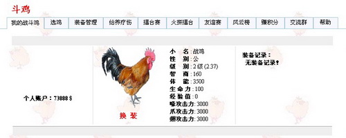 还有,别忘时时喂一下自己的斗鸡,体力不够可无法上战场。装备好自己的斗鸡后,就准备上擂台打擂吧,看见哪个不顺眼,大吼一声,我不服,要挑擂!