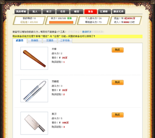 帮派斗争不是请客吃饭,没有好装备可没法行走江湖,武器、防具、交通工具,应有尽有。