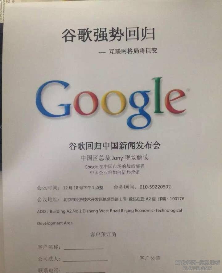 【IT教学网报道】12月13日上午,有人在朋友圈晒出邀请函称,谷歌将于12月18日下周五举行新闻发布会,由中国区总裁Jony现场解读谷歌在中国市场的战略部署。消息一经曝出,立刻引起了业内人士和媒体的关注,如果消息属实,那么对于国内的互联网企业来说,无疑是个重磅炸弹。