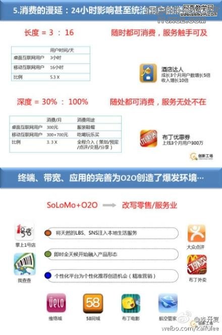 第五点非常重要,游戏毕竟是第一步,不是最大价值的来源,更大的价值是来自商务,很多人在手机上京东好不好?相当的不错,现在我们可以看到在淘宝上听说有接近10万的成交量,手机跟PC不一样,我们买很多东西在PC上看得更清楚,更适合竞价选择等等功能。但是手机在购买 方面有两个巨大的优势,第一是它的长度,手机一定在身边,它可以达到让我们随时可消费。移动互联网服务无处不在,700元可以用手机的LBS的能力让我们知道个人的消费习惯和位置,推荐离我们最近的餐馆、卡拉OK等等不同的服务。比如创新工厂酒店达人可以定酒店,带来的这个时代就是SOLOMO+O2O的习惯,它可以帮助商家推出最好的服务给周围的用户,达到获取用户、保留用户,让用户多次消费的欲望,对商家的服务,非常好的平衡了用户的需求和商家的需求,而且能够全天候的使用。