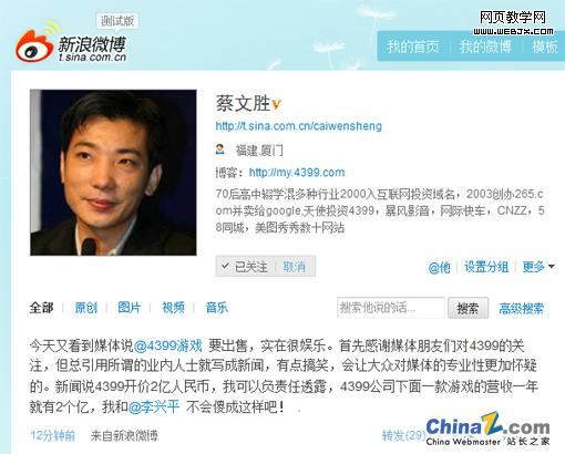 站长之家Chinaz.com 9月13日消息:知名天使投资人、4399小游戏董事长蔡文胜在今天下午回应了新浪收购4399一事,称许多媒体在没有经过考证的情况下,仅仅通过所谓业内人士的消息就传播假消息,同时他表示,4399旗下有一款游戏一年营收就有2个亿,自己跟李兴平没有那么傻。