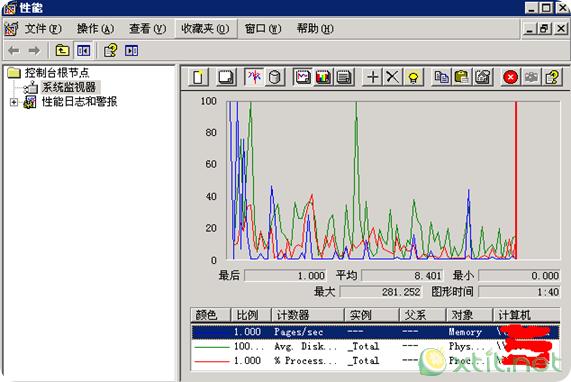 Windows服务器系统中有一个工具,叫性能计数器,你可以通过“开始-控制面板-管理工具-性能”打开它。在默认的系统监视器配置中,我们可以看到内存、硬盘、CPU的实时性能参数。