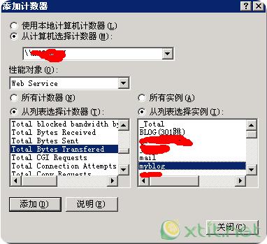 接下来,我们通过设置,可以让这个工具监视并记录你的网站流量。删掉默认的三个性能计数器,然后添加一个新的计数器。性能对象选择Web Service,接着从列表中选择计数器,我们的目的是统计BLOG的网络流量,所以我们选择“Total Bytes Transfered”这一项,意思是Web 服务发送或接收到的总字节数(从服务启动后)。在右边的实例中选择你建立在IIS中的网站名。最后点击添加按钮。如下图: