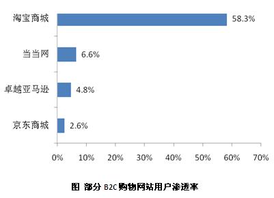 CNNIC调查显示:截至2010年6月,中国的网购用户中,有58.3%的人过去半年在淘宝商城购物过,而传统的老牌B2C,像当当网、卓越亚马逊的用户渗透率仅为6.6%和4.8%,后起之秀,主打3C产品起家的京东商城的渗透率也快速提升到了2.6%。